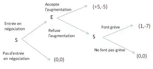 Dans ce cas, la menace de grève n’est pas crédible, E va préférer refuser car il sait que les salariés ne feront pas grève malgré cette menace (les salariés préfèrent 0 à -1) et ceci malgré le fait que potentiellement en refusant E perdra plus (-7) qu’en acceptant l’augmentation (-5).