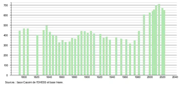 - ↑ Population municipale de référence en vigueur au 1er janvier 2025, millésimée 2022, définie dans les limites territoriales en vigueur au 1er janvier 2024, date de référence statistique : 1er janvier 2022.