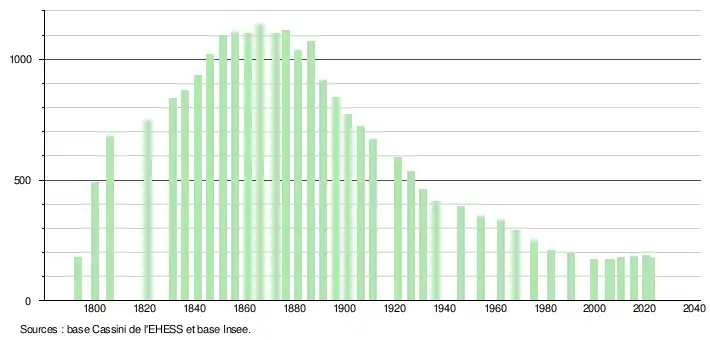 L'évolution du nombre d'habitants est connue à travers les recensements de la population effectués dans la commune depuis 1793. Pour les communes de moins de 10 000 habitants, une enquête de recensement portant sur toute la population est réalisée tous les cinq ans, les populations de référence des années intermédiaires étant quant à elles estimées par interpolation ou extrapolation[18]. Pour la commune, le premier recensement exhaustif entrant dans le cadre du nouveau dispositif a été réalisé en 2005[19].