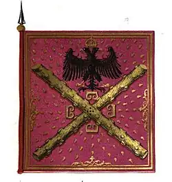 - ↑ La bannière, de couleur violette, comporte une croix de Saint-André surmontée d'un aigle bicéphale noir couronné, symbole de la puissance impériale de l'Empire byzantin et de la Maison des Habsbourg, le tout entouré de quatre « B », déjà présents dans les armoiries du Paléologue et également récurrents dans la décoration des Habsbourg l' Ordre de la Toison d'or.