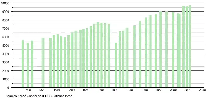 L'évolution du nombre d'habitants est connue à travers les recensements de la population effectués dans la commune depuis 1793. Pour les communes de moins de 10 000 habitants, une enquête de recensement portant sur toute la population est réalisée tous les cinq ans, les populations de référence des années intermédiaires étant quant à elles estimées par interpolation ou extrapolation[50]. Pour la commune, le premier recensement exhaustif entrant dans le cadre du nouveau dispositif a été réalisé en 2008[51].