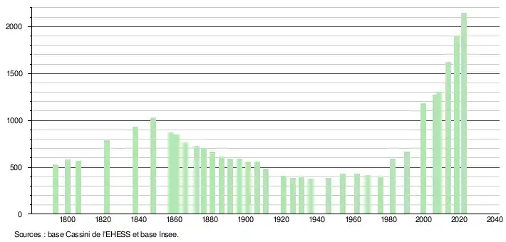 L'évolution du nombre d'habitants est connue à travers les recensements de la population effectués dans la commune depuis 1793. Pour les communes de moins de 10 000 habitants, une enquête de recensement portant sur toute la population est réalisée tous les cinq ans, les populations de référence des années intermédiaires étant quant à elles estimées par interpolation ou extrapolation[18]. Pour la commune, le premier recensement exhaustif entrant dans le cadre du nouveau dispositif a été réalisé en 2008[19].