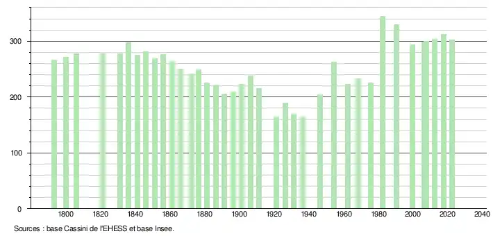 - ↑ Population municipale de référence en vigueur au 1er janvier 2025, millésimée 2022, définie dans les limites territoriales en vigueur au 1er janvier 2024, date de référence statistique : 1er janvier 2022.