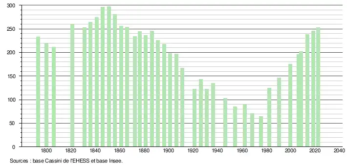 L'évolution du nombre d'habitants est connue à travers les recensements de la population effectués dans la commune depuis 1793. Pour les communes de moins de 10 000 habitants, une enquête de recensement portant sur toute la population est réalisée tous les cinq ans, les populations de référence des années intermédiaires étant quant à elles estimées par interpolation ou extrapolation[12]. Pour la commune, le premier recensement exhaustif entrant dans le cadre du nouveau dispositif a été réalisé en 2008[13].