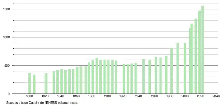 L'évolution du nombre d'habitants est connue à travers les recensements de la population effectués dans la commune depuis 1800. Pour les communes de moins de 10 000 habitants, une enquête de recensement portant sur toute la population est réalisée tous les cinq ans, les populations de référence des années intermédiaires étant quant à elles estimées par interpolation ou extrapolation[15]. Pour la commune, le premier recensement exhaustif entrant dans le cadre du nouveau dispositif a été réalisé en 2008[16].