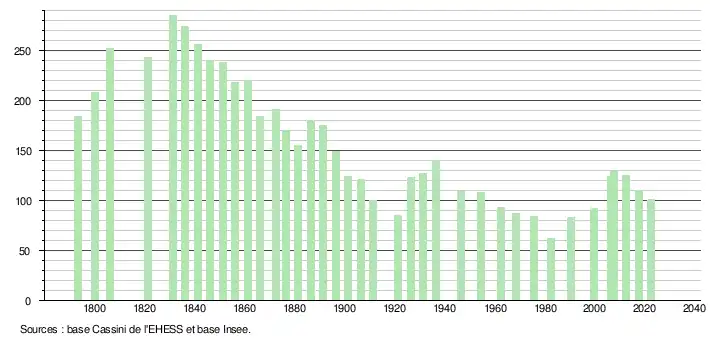 L'évolution du nombre d'habitants est connue à travers les recensements de la population effectués dans la commune depuis 1793. Pour les communes de moins de 10 000 habitants, une enquête de recensement portant sur toute la population est réalisée tous les cinq ans, les populations de référence des années intermédiaires étant quant à elles estimées par interpolation ou extrapolation[20]. Pour la commune, le premier recensement exhaustif entrant dans le cadre du nouveau dispositif a été réalisé en 2007[21].