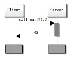 - Flot de contrôle: flèche horizontale avec le préfixe 'call', flèche en pointillée pour le retour, symbole de suspension ou d'appel de méthode entre les deux.