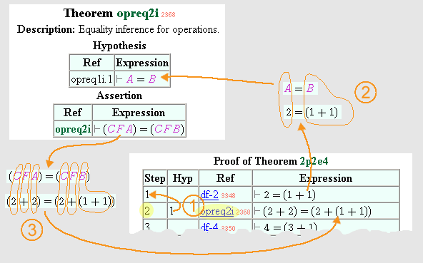 Voici un exemple détaillé de la façon dont cet algorithme fonctionne. Les étapes 1 et 2 du théorème 2p2e4 dans le Metamath Proof Explorer (set.mm) sont représentées à gauche. Nous allons expliquer comment Metamath utilise son algorithme de remplacement pour vérifier que l'étape 2 est la conséquence logique de l'étape 1 lorsque vous utilisez le théorème opreq2i. L'étape 2 indique que (2 + 2) = (2 + (1 + 1). C'est la conclusion du théorème opreq2i. Le théorème opreq2i affirme que si A = B = A = B, puis ((C F A) = (C F B)) = ((C F A) = (C F B)). Ce théorème n'apparaîtrait jamais sous cette forme cryptique dans un manuel, mais sa formulation littéraire est banale: lorsque deux quantités sont égales, il peut être remplacé l'un par l'autre dans une opération. Pour vérifier la preuve Metamath essaie d'unifier ((C F A) = (C F B)) = ((C F A) = (C F B)) avec (2 + 2) = (2 + (1 + 1). Il n'y a qu'une seule FAçon de le faire: unifier C avec 2, F avec +, A avec 2 et B avec (1 + 1). Alors maintenant Metamath utilise la prémisse de opreq2i. Cette prémisse indique que A = B. En rA = Bison de son calcul précédent, Metamath sait que A doit être remplacé par 2 et A = B par 1 + 1). Le A = B prémisse A = A = B devient 2=(1 + 1) et donc l'étape 1 est générée. Dans son étape 1 il est unifié avec df-2. df-2 est la définition du nombre 2 et indique que 2 = (1 + 1). Ici l'unification est simplement une question de constantes et est directe (sans problème des variables à remplacer). La vérification est terminée et ces deux étapes de la preuve2p2e4 sont correctes.