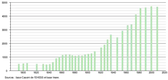 L'évolution du nombre d'habitants est connue à travers les recensements de la population effectués dans la commune depuis 1793. À partir du , les populations légales des communes sont publiées annuellement dans le cadre d'un recensement qui repose désormais sur une collecte d'information annuelle, concernant successivement tous les territoires communaux au cours d'une période de cinq ans. Pour les communes de moins de 10 000 habitants, une enquête de recensement portant sur toute la population est réalisée tous les cinq ans, les populations légales des années intermédiaires étant quant à elles estimées par interpolation ou extrapolation[21]. Pour la commune, le premier recensement exhaustif entrant dans le cadre du nouveau dispositif a été réalisé en 2008[22],[Note 3].