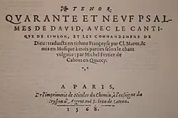 - En 1559, il publie Quarante et neuf psalmes de David, avec le cantique de Simeon, et les Commandemens de Dieu : traduitz en rime françoise par C. Marot, et mis en musique à trois parties selon le chant vulgaire par Michel Ferrier de Cahors en Quercy. – Lyon : Robert Granjon, 1559. – 3 vol. 8° obl, musique, caractères de civilité. Den Haag KB : 1708 G 32 (partie de Tenor seule)[1].