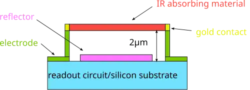 Un microbolomètre est constitué d'un réseau de pixels, chaque pixel étant composé de plusieurs couches. Le diagramme en coupe représenté sur la figure 1 fournit un schéma de principe du pixel. Chaque entreprise qui fabrique des microbolomètres a sa propre procédure de production et utilise même une variété de matériaux absorbants différents. Dans cet exemple, la couche inférieure est constituée d'un substrat silicium et d'un circuit intégré de lecture (ROIC). Les contacts électriques sont déposés puis gravés sélectivement. Un réflecteur, par exemple un miroir en titane, est créé sous le matériau absorbant les infrarouges. Comme une certaine lumière peut traverser la couche absorbante, le réflecteur redirige cette lumière pour assurer la plus grande absorption possible, permettant ainsi de produire un signal plus fort. Ensuite, une couche sacrificielle est déposée de sorte que plus tard dans le processus, un espace peut être créé pour isoler thermiquement le matériau absorbant les infrarouges du ROIC. Une couche de matériau absorbant est ensuite déposée et gravée sélectivement afin que les contacts finaux puissent être créés. Pour créer la structure finale en forme de pont représentée sur la figure 1, la couche sacrificielle est retirée de sorte que le matériau absorbant soit suspendu à environ 2 µm au-dessus du circuit de lecture. Parce que les microbolomètres ne subissent aucun refroidissement, le matériau absorbant doit être thermiquement isolé du ROIC inférieur et la structure en forme de pont permet cela. Une fois le réseau de pixels créé, le microbolomètre est encapsulé sous vide pour augmenter la longévité du dispositif. Dans certains cas, tout le processus de fabrication est effectué sans casser le vide.