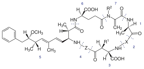 Squelette de la microcystine : 1, D-Alanine ; 2, X (variable) ; 3, D-MeAsp (D-érythro-b-méthyl-D-acide aspartique) ; 4, Z (variable) ; 5, Adda (acide (2S, 3S, 8S, 9S)-3-amino-9-méthoxy-2-6-8-triméthyl-10-phényldéca-4,6-diènoïque) ; 6, D-glutamate ; 7, Mdha (N-méthyldéshydroalanine). R1 et R2 sont H (déméthylmicrocystines) ou CH3[17].