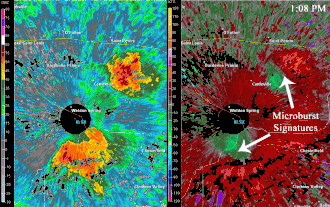 Rafales descendantes vue au radar météorologique (réflectivité à gauche, vitesse radiale à droite).