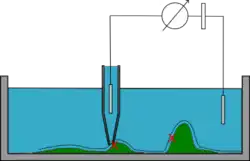 Une différence de potentiel est appliquée entre les deux électrodes Ag/AgCl, l'une étant dans la micro-pipette et l'autre dans le réservoir de solution. Cette différence de potentiel génère un courant ionique, donc un flux d'ions entrant et sortant de la micro-pipette. La conductance (et indirectement la résistance) entre les deux électrodes est mesurée, et dépend du flux d'ions en solution.