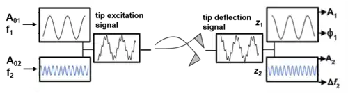 Prenons par exemple la configuration bimodale AM-FM. Le premier mode propre est excité pour atteindre une amplitude libre (pas d'interaction) et un amplificateur à détection synchrone suit les évolutions de son amplitude et de son déphasage. La boucle de rétroaction principale maintient l'amplitude à une valeur de consigne en agissant sur la position verticale de la pointe (c'est le mode AM). Dans une expérience de cartographie nanomécanique, doit être maintenu en dessous de 90°, c'est-à-dire que le microscope fonctionne en régime répulsif. Une seconde boucle de rétroaction FM agit en même temps sur l'autre mode propre : une boucle à verrouillage de phase régule la fréquence d'excitation tout en gardant le déphasage du deuxième mode à 90°. Une boucle de rétroaction supplémentaire peut être utilisée pour maintenir l'amplitude à une valeur constante.