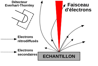 En microscopie optique classique, la lumière visible réagit avec l’échantillon et les photons réfléchis sont analysés par des détecteurs ou par l’œil humain. En microscopie électronique, le faisceau lumineux est remplacé par un faisceau d’électrons primaires qui vient frapper la surface de l’échantillon et les photons réémis sont remplacés par tout un spectre de particules ou rayonnements : électrons secondaires, électrons rétrodiffusés, électrons Auger ou rayons X. Ces différentes particules ou rayonnements apportent différents types d’informations sur la matière dont est constitué l’échantillon[11].