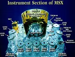 MSX observe les longueurs d'onde de 4,29 µm, 4,35 µm, 8,28 µm, 12,13 µm, 14,65 µm et 21,3 µm. Le télescope infrarouge de 33 cm SPIRIT III refroidi par un bloc d'hydrogène solide et équipé de cinq capteurs infrarouges à balayage ligne au plan focal.