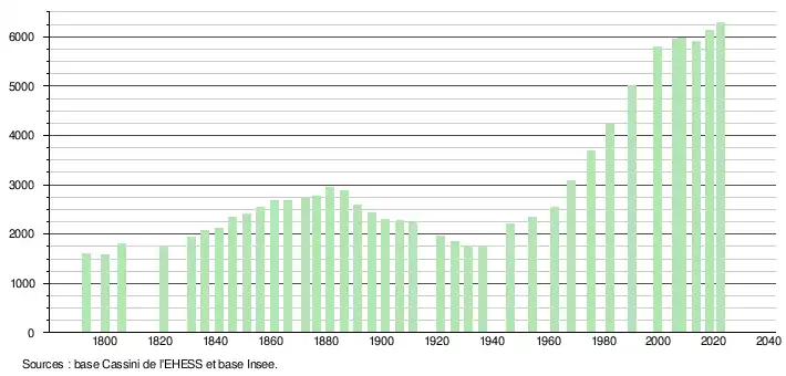L'évolution du nombre d'habitants est connue à travers les recensements de la population effectués dans la commune depuis 1793. Pour les communes de moins de 10 000 habitants, une enquête de recensement portant sur toute la population est réalisée tous les cinq ans, les populations de référence des années intermédiaires étant quant à elles estimées par interpolation ou extrapolation[35]. Pour la commune, le premier recensement exhaustif entrant dans le cadre du nouveau dispositif a été réalisé en 2008[36].
