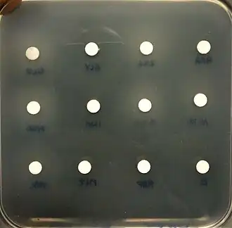 soit le milieu est solide et présenté en boîte de Petri. Après ensemencement, on place des disques de glucides ou d'autres sources de carbone à étudier. Observer alors la culture ou non autour du disque.Auxanogramme du carbone en boite de Petri par la méthode des disques - Pascal FRAPERIE
