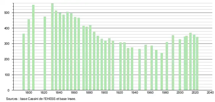 L'évolution du nombre d'habitants est connue à travers les recensements de la population effectués dans la commune depuis 1793. Pour les communes de moins de 10 000 habitants, une enquête de recensement portant sur toute la population est réalisée tous les cinq ans, les populations de référence des années intermédiaires étant quant à elles estimées par interpolation ou extrapolation[29]. Pour la commune, le premier recensement exhaustif entrant dans le cadre du nouveau dispositif a été réalisé en 2008[30].
