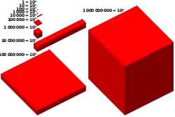 A est un cube ; B est constitué de 1 000 cubes de type A. C est constitué de 1 000 cubes de type B et D, de 1 000 cubes de type C. Ainsi, il y a 1 million de cubes A dans le cube C et 1 milliard de cubes A dans le cube D. De même, par exemple, il y a un milliard de millimètres cubes d'eau dans un mètre cube d'eau.