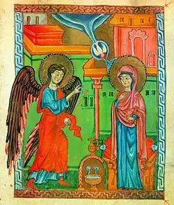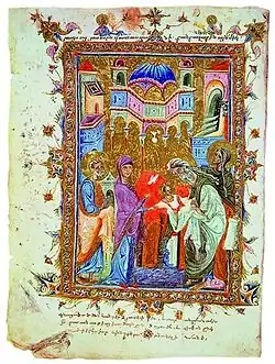 L'évangéliaire d'Etchmiadzin (Matenadaran, Ms. 2374[16]) est un des autres exemples fameux de ces premiers manuscrits. Réalisé en 989 au monastère de Bgheno-Noravank, ce somptueux ouvrage est doté d'une reliure byzantine en ivoire (seconde moitié du VIe siècle[17]) et incorpore quatre miniatures en pleine page, regroupées sur deux feuillets, des VIe et VIIe siècles[17], au style proche des fresques du VIIe siècle mais traduisant une influence sassanide, avec les tenues et les coiffures des rois mages[18], par exemple[19],[12] ; ces quatre miniatures au caractère monumental dans le traitement des personnages, dotés de grands yeux et aux visages au modelé librement brossé, dont le décor architectural rappelle les édifices paléochrétiens, s'inscrivent dans la tradition picturale paléochrétienne[19] et constituent ainsi une persistance du répertoire antique[5]. D'autres miniatures des XIe et XIIe siècles ornent ce manuscrit, notamment des miniatures liminaires illustrant les thèmes majeurs du salut et les quatre Évangélistes, et sont d'un style moins antiquisant que celles de l'Évangile de la reine Mlké[11], tout en faisant preuve de fraîcheur et de sensibilité et en adoptant des fonds neutres[20]. « Exemple exceptionnel de l'épanouissement de la peinture qui s'observe au lendemain de la domination arabe »[11], il représente avec l'Évangile de la reine Mlké « la plus haute expression d'un courant classique antiquisant qui traverse aux IXe et Xe siècles la peinture en Arménie, parfaitement distinct du courant plus abstrait et décoratif qui la caractérise aussi pourtant à la même époque, représenté notamment par l'Évangile de Baltimore »[20].