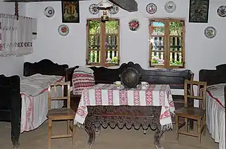 | Temple réformé de Khoust (ancienne église catholique Sainte-Élisabeth, XIIIe – XIVe siècles). | Maison traditionnelle hongroise du village de Vychkovo, actuel raïon de Khoust en Transcarpathie, construite en 1879 (aujourd'hui au musée d'architecture et des traditions populaires d'Oujgorod). Son architecture est influencée par la tradition ruthène de la Haute Tisza: construction en rondins, galerie semi-couverte, toit à quatre versants d'une structure en treillis, décoration des fenêtres et des portes. | Intérieur typique hongrois d'une ferme de la fin du XIXe siècle en Transcarpathie. |