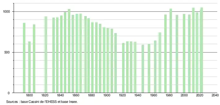 L'évolution du nombre d'habitants est connue à travers les recensements de la population effectués dans la commune depuis 1793. Pour les communes de moins de 10 000 habitants, une enquête de recensement portant sur toute la population est réalisée tous les cinq ans, les populations de référence des années intermédiaires étant quant à elles estimées par interpolation ou extrapolation[23]. Pour la commune, le premier recensement exhaustif entrant dans le cadre du nouveau dispositif a été réalisé en 2006[24].