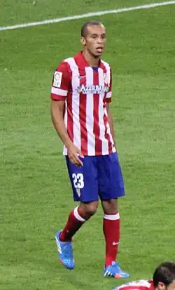 À l'été 2011, il signe à l'Atlético Madrid. Pour sa 1e saison il remporte la Ligue Europa 2012 en étant titulaire pour plus de 15 matches. Il remporte également la Supercoupe de l'UEFA face à Chelsea FC. Il joue au total plus de 40 matches durant cette saison. La saison suivante avec son club, il va arracher le titre de la Coupe d'Espagne 2013 à son rival local le Réal Madrid. Il va marquer un but dans les prolongations à la 98e minute qui va faire gagner son équipe. Il est auteur d'une superbe saison 2013-2014 comme la plupart de ses coéquipiers où son équipe remportera la Liga 2014 devant le FC Barcelone et le Réal Madrid. et jouera la finale de la Ligue des champions perdue 4-1 face au Real Madrid. L'Atlético perdra aussi la Coupe d'Espagne de football 2013-2014 au détriment du Real Madrid vainqueur du FC Barcelone 2 buts à 1 en finale. Il aura joué plus de 170 matches avec le club madrilène en tant que défenseur majeur de l'équipe.