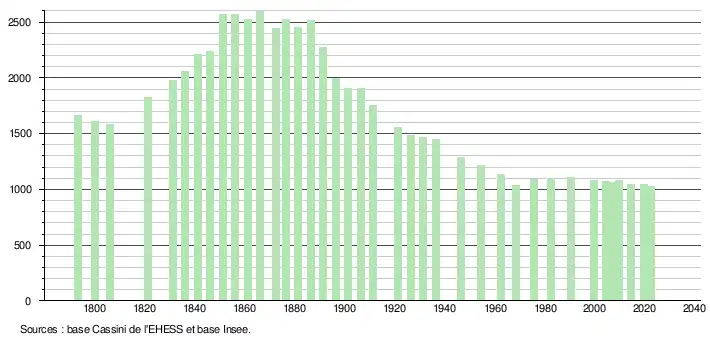 | L'évolution du nombre d'habitants est connue à travers les recensements de la population effectués dans la commune depuis 1793. Pour les communes de moins de 10 000 habitants, une enquête de recensement portant sur toute la population est réalisée tous les cinq ans, les populations de référence des années intermédiaires étant quant à elles estimées par interpolation ou extrapolation[37]. Pour la commune, le premier recensement exhaustif entrant dans le cadre du nouveau dispositif a été réalisé en 2004[38]. En 2022, la commune comptait 1 031 habitants[Note 7], en évolution de −0,87 % par rapport à 2016 (Tarn : +2,52 %, France hors Mayotte : +2,11 %). |
