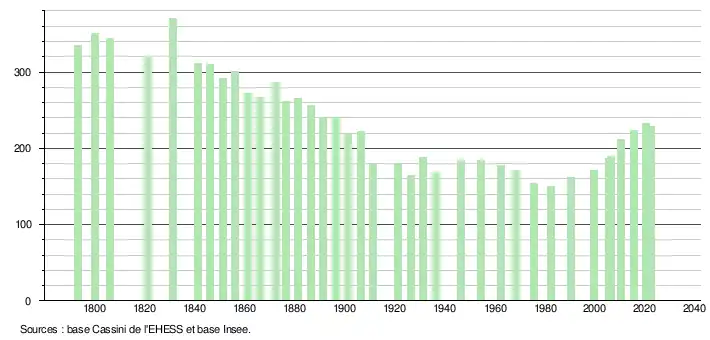 | L'évolution du nombre d'habitants est connue à travers les recensements de la population effectués dans la commune depuis 1793. Pour les communes de moins de 10 000 habitants, une enquête de recensement portant sur toute la population est réalisée tous les cinq ans, les populations de référence des années intermédiaires étant quant à elles estimées par interpolation ou extrapolation[21]. Pour la commune, le premier recensement exhaustif entrant dans le cadre du nouveau dispositif a été réalisé en 2005[22]. En 2022, la commune comptait 229 habitants[Note 2], en évolution de +2,23 % par rapport à 2016 (Gers : +1,04 %, France hors Mayotte : +2,11 %). |
