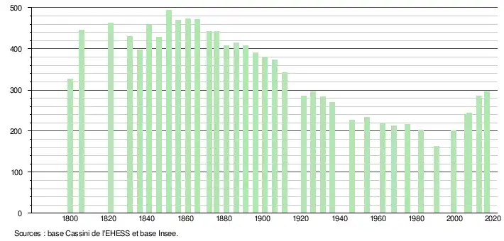 L'évolution du nombre d'habitants est connue à travers les recensements de la population effectués dans la commune depuis 1800. Pour les communes de moins de 10 000 habitants, une enquête de recensement portant sur toute la population est réalisée tous les cinq ans, les populations de référence des années intermédiaires étant quant à elles estimées par interpolation ou extrapolation[4]. Pour la commune, le premier recensement exhaustif entrant dans le cadre du nouveau dispositif a été réalisé en 2007[5].