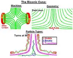 Si l'un des pôles de la bouteille magnétique est inversé, elle devient une cuspide biconique, qui peut également confiner des particules chargées[40],[41],[42]. Les cuspides biconiques ont d'abord été étudiées par Harold Grad à l'Institut des sciences mathématiques de Courant. Des études ont révélé la présence de différents types de particules à l'intérieur d'une cuspide biconique. L'approche la plus financée est celle du réacteur à fusion compact qui a été supportée par Lockheed-Martin depuis 2007[43].