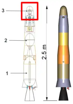 - un mini-lanceur à deux étages à propergol solide (300 kg) capable de rejoindre l'orbite basse martienne avec le conteneur d'échantillons en charge utile dont la masse est estimée à 5 kg. Ce lanceur est stocké dans une coque qui doit maintenir sa température dans une fourchette réduite et qui doit lui permettre de séjourner un an à la surface. Ses deux étages sont stabilisés 3 axes par des propulseurs monoergol. Le lanceur haut de 2,5 mètres doit placer le conteneur sur une orbite basse elliptique de 500 x 100 km,