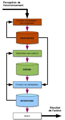 - Les désirs (Desires), ou options, qui représentent l'ensemble des opportunités offertes à l'agent et sont générés à partir des croyances de l'agent à un moment donné et des objectifs à plus long terme que l'agent a pu se fixer.