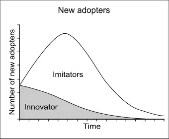 - p : le coefficient d'innovation ou de l'influence externe, caractérisant la probabilité que quelqu'un qui n'utilise pas encore le produit se mette à l'utiliser à cause d'une influence externe au processus de diffusion: publicité, prix, notoriété du produit dans les médias, besoins personnels, facilité d'usage. Ce segment caractérise les usagers amateurs de nouveauté, influencés davantage par les caractéristiques du produit que par l'opinion de la majorité. Le nombre des nouveaux acheteurs de ce type est maximum au début, puis décroît régulièrement.