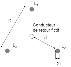 Pour un système triphasé on considère un conducteur de retour fictif situé entre les 3 phases. Les équations ci-dessus sont encore applicables, il faut de plus calculer les inductances mutuelles entre phases[8]. Attention les conducteurs sont simples ici, pour le détails avec des faisceaux de conducteur se référer à la note[7].