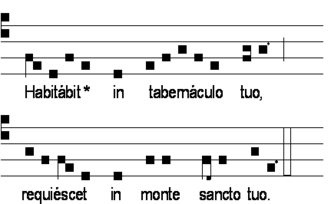 Cet exemple (Ps 14:1) est assez typique d'un mode de type B*, la teneur étant ici notée par un mi. L'intonation sur « Habitabit » introduit bien des variations de part et d'autre de la teneur, mais celle-ci est comme instable : dès qu'elle est touchée par la mélodie, c'est pour la renvoyer vers le grave ou l'aigu. Dans le premier segment, la teneur tombe constamment en cadence sur le ré. Inversement, le deuxième segment « in monte sancto tuo » est typique d'un évitement de cette corde modale, attente sur le demi-ton supérieur qui ne se résout sur la teneur qu'à la dernière syllabe.