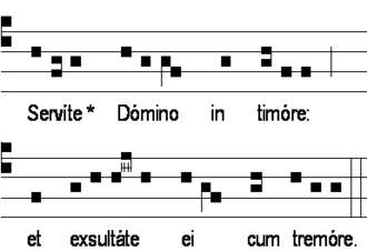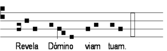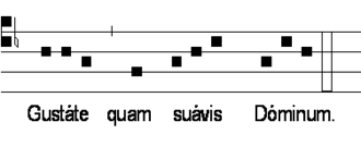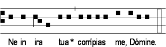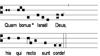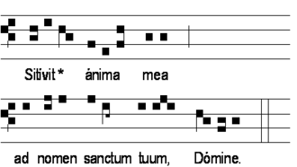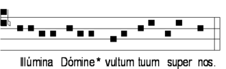 Cet exemple (Ps 8:2) est typique du premier mode : une superposition des teneurs A, C et B (formule ACB). L'intonation est typique de ce mode, ainsi que le phrasé qui retombe entre une teneur en la (premier et deuxième segment), puis en fa (troisième segment), pour revenir se poser sur le ré.