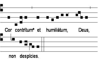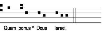 L'exemple ci-dessus est un mode mixte. Dans ces deux incises on y reconnaît bien finalement une base de type A sur la corde sol. Les initiales, en revanche, sont nettement posées sur le do, qui joue le rôle d'une corde modale de type C, mais la broderie au demi-ton inférieur est systématiquement évitée. Quand le si naturel finit par apparaître, sur « recto », il amorce la descente sur le sol, et appartient donc déjà à la teneur A inférieure. La « version courte » de l'antienne (Ps 72:1a) suit la même structure, de manière encore plus simple :