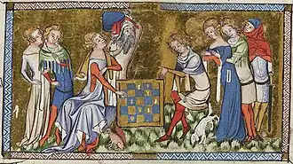 Jean II le Bon, roi de France (1350-1364), adoubant ses proches en tenue de cérémonie chevaliers le jour de son sacre (BNF ms. fr. 73, fol. 386).