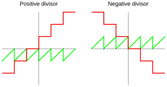 En effet, le reste de la division reste positif dans tous les cas (voir schéma ci-contre), contrairement à de nombreuses autres définitions utilisées en informatique (voir sections ci-après).