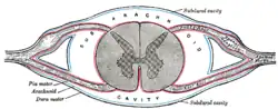 Cette dernière région entoure le canal épendymaire, qui constitue l'extension des ventricules cérébraux et contient un liquide dénommé liquide cérébrospinal, ou liquide céphalo-rachidien selon l'ancienne nomenclature (LCS ou LCR).