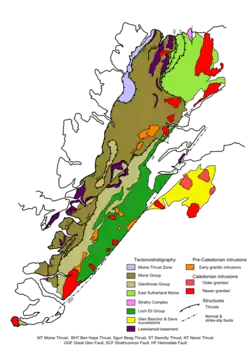 L'origine de cette configuration a donné lieu à la « Controverse des Highlands », certains géologues comme Roderick Murchison pensant que les gneiss étaient plus récents et avaient une origine métamorphique, alors que d'autres, comme James Nicol ou Charles Lapworth pensaient qu'il s'agissait d'une origine tectonique. En 1883 et 1884, les géologues Ben Peach et John Horne ont été envoyés par Archibald Geikie, Directeur du British Geological Survey sur le terrain pour effectuer une mission de cartographie. Cette étude a conclu à une origine tectonique et non métamorphique. Le Moine Thrust a été identifié en 1907 comme la toute première faille de chevauchement[1].