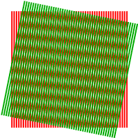 Considérons deux réseaux de même pas p, mais désorientés d'un angle α. De loin, on voit également apparaître des lignes sombres et claires : les lignes claires correspondent aux lignes des nœuds, c'est-à-dire aux lignes passant par les points d'intersection des deux réseaux.