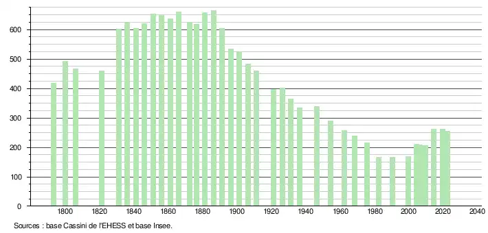 L'évolution du nombre d'habitants est connue à travers les recensements de la population effectués dans la commune depuis 1793. Pour les communes de moins de 10 000 habitants, une enquête de recensement portant sur toute la population est réalisée tous les cinq ans, les populations de référence des années intermédiaires étant quant à elles estimées par interpolation ou extrapolation[14]. Pour la commune, le premier recensement exhaustif entrant dans le cadre du nouveau dispositif a été réalisé en 2004[15].