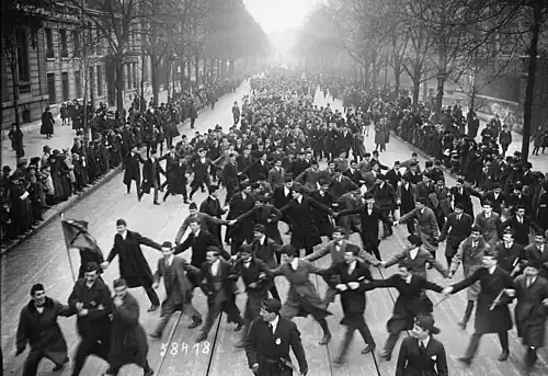 Parfois, ce serpent humain aux anneaux lumineux a des difficultés avec la police. Des sergents de ville grincheux, ou seulement tatillons, n'osant pas rompre la file indienne, jouent de ruse ; ils poussent le monôme sur le trottoir de droite, au risque d'interrompre pendant cinq minutes la circulation des tramways ; une fois du côté du lycée Louis-le-Grand, le monôme remonte vers la grille du Luxembourg, puis il tourne et descend la rue de Médicis ; le voilà dans la zone plus tranquille de l'Odéon et du Sénat, dans la morne rue de Tournon ou dans la rue de Vaugirard, non moins morne : c'est là que l'attendaient les sergents de ville astucieux ; sûrs de ne pas provoquer de scandale dans ces quartiers province, ils dispersent le monôme ; et, si le monôme, fort d'un droit consacré par l'usage, essaie de résister, ils arrêtent les meneurs et les conduisent au poste de police de la place Saint-Sulpice.
