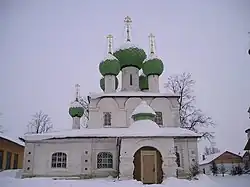 L’église de la Dormition de la Sainte mère de Dieu est un édifice remarquable témoin de l’architecture du XVIIe siècle construit en 1628. Il étonne par sa perfection et son originalité provenant de schémas de construction inhabituels. Sa nouvelle variante de toiture pyramidale bouleverse l'organisation traditionnelle des bâtiments et renforce son effet décoratif. Cette innovation est promise à un bel avenir[2]. Trois clochers en pointe auxquels sont accrochés de petits bulbes couronnent la partie dédiée au culte comme un trident. Le bâtiment étant construit sur une élévation de terrain, la perspective de l’ensemble gagne en légèreté et en élégance. Un réfectoire est situé à côté de la petite église. Un pilier central en soutient la voûte. Au rez-de-chaussée, se trouvent les locaux administratifs. Vers l’est trois absides se déploient au chevet de l’église. La décoration est simple et modeste, chaque détail soulignant adéquatement les proportions relativement modestes du bâtiment.