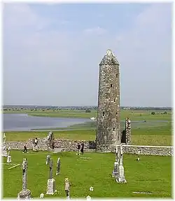- La tour ronde. Selon certains, elle aurait été construite au Xe siècle par Fergal O'Rourke (mort en 964). Le Chronicon Scotorum signale son érection (restauration ?) en 1124 sur ordre de Toirdelbach Ua Conchobair, roi de Connachtet de Gilla Christ Ua Maoileoin, abbé de Clonmacnoise. Onze ans plus tard, elle fut partiellement détruite par la foudre. Sa partie supérieure, visible de nos jours, a donc été refaite, dans une maçonnerie beaucoup plus fruste. La légende dit que la partie effondrée à cause de la foudre a été réutilisée pour construire le Temple Finghín.