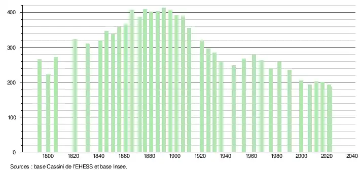 L'évolution du nombre d'habitants est connue à travers les recensements de la population effectués dans la commune depuis 1793. Pour les communes de moins de 10 000 habitants, une enquête de recensement portant sur toute la population est réalisée tous les cinq ans, les populations de référence des années intermédiaires étant quant à elles estimées par interpolation ou extrapolation[25]. Pour la commune, le premier recensement exhaustif entrant dans le cadre du nouveau dispositif a été réalisé en 2006[26].